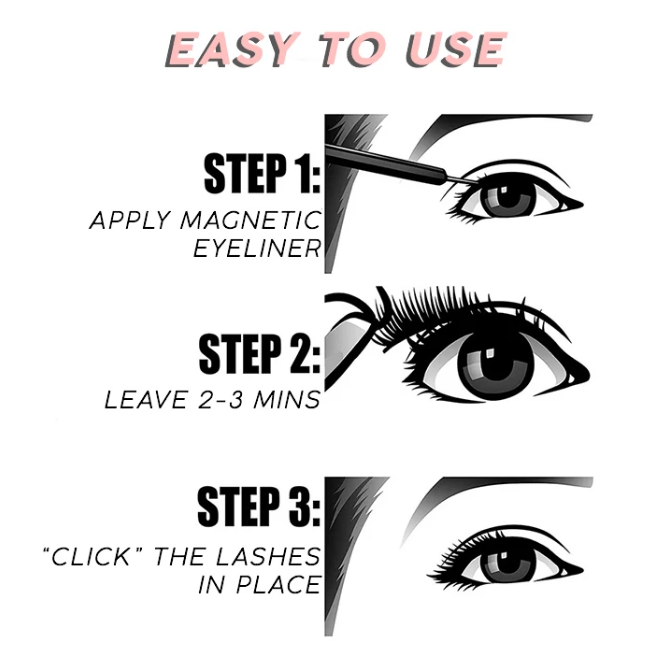 Simply apply the magnetic eyeliner, and the magnetic eyelash will effortlessly ‘clicks’ to the eyeliner!